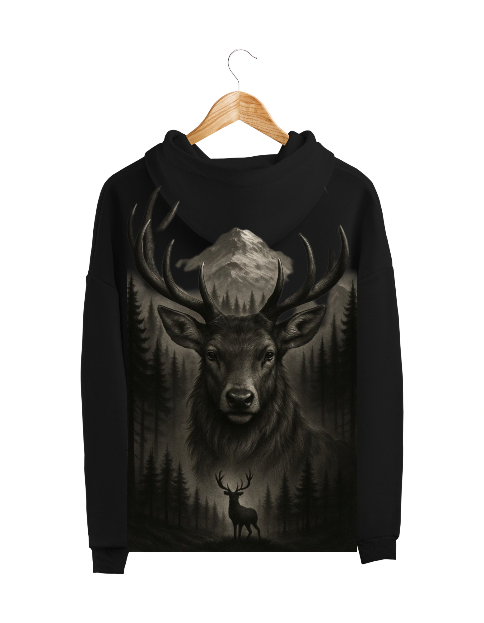 Featuring a detailed artistic deer and mountain forest design, this hoodie captures the perfect balance of power and peace, making it a must-have for those who love adventure and individuality.